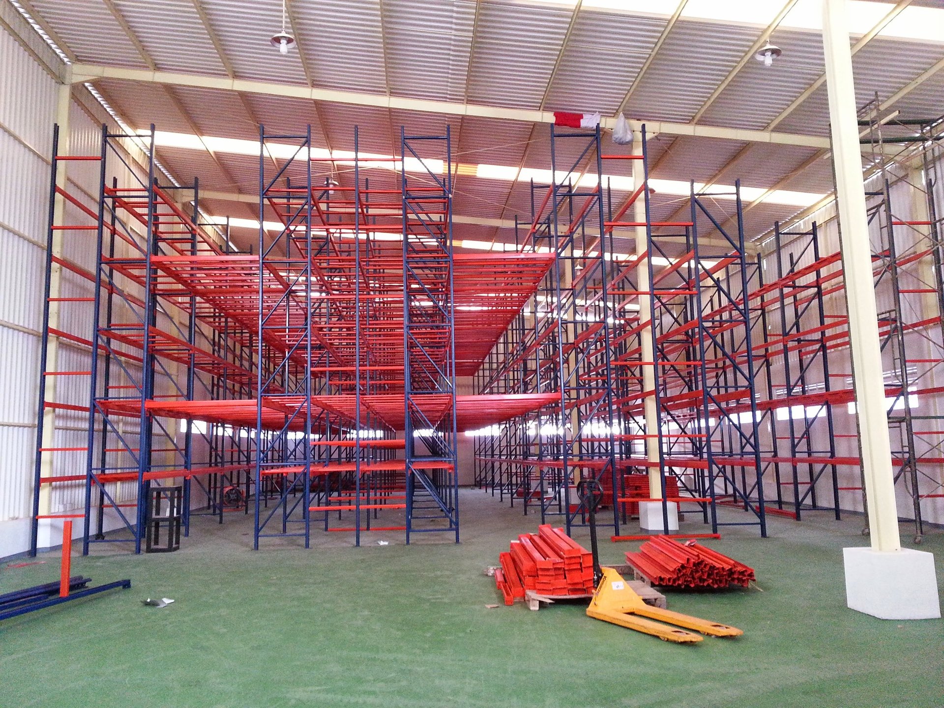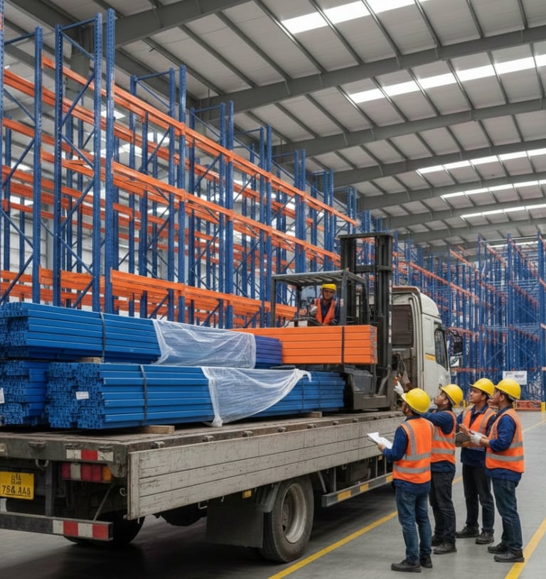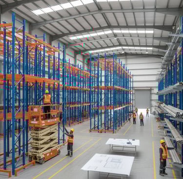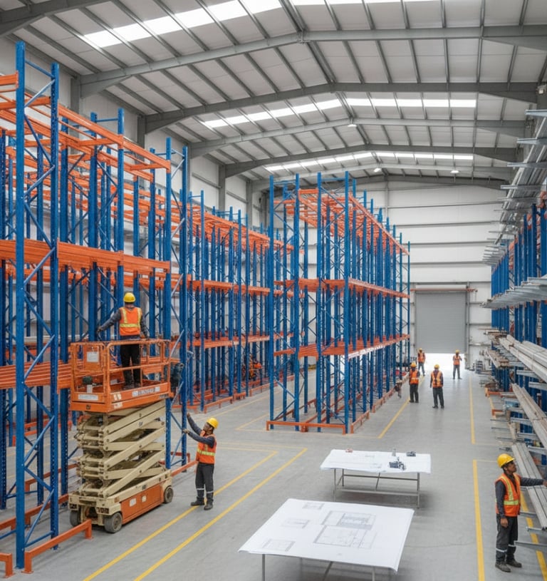 Pemasangan berbagai tipe rak gudang (Selective Pallet, Drive-in, Cantilever, dll.) yang disesuaikan dengan layout gudang Anda.