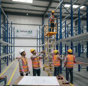 Kami menerapkan prosedur Kesehatan dan Keselamatan Kerja (K3) yang ketat. Tim teknisi kami bekerja menggunakan Alat Pelindung Diri (APD) lengkap dan terlatih untuk memitigasi risiko kecelakaan kerja di lingkungan gudang.
